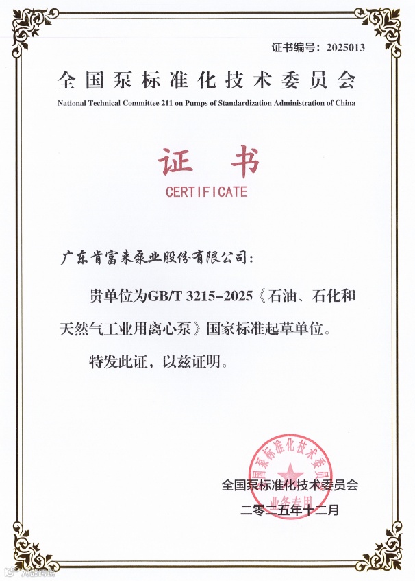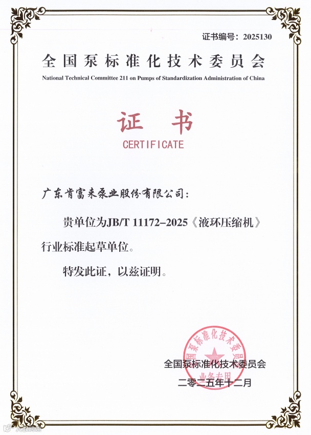 肯富来泵业作为GB/T3215-2025《石油、石化和天然气工业用离心泵》和JB/T11172-2025《液环压缩机》标准起草单位,获颁标准起草单位证书。两项标准的发布实施,与国际标准接轨,对离心泵和液环压缩机两大核心设备制定标准,形成覆盖石油、石化、天然气工业关键装备的完整标准体系,提高行业准入门槛,淘汰技术落后、质量不达标产品,有效提升产品的质量和可靠性,推动行业向高效、节能、智能化方向升级发展。