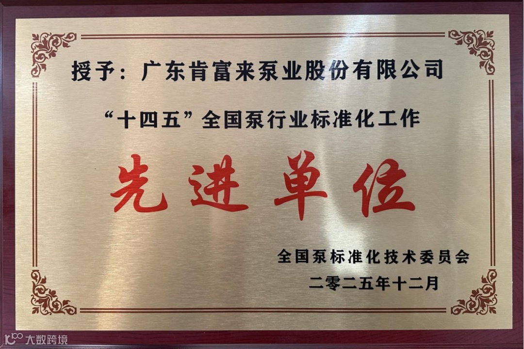 肯富来泵业荣获“十四五”全国泵行业标准化工作先进单位,并被授予牌匾。“十四五”期间,泵行业面临着转型升级与高质量发展的双重挑战。肯富来泵业积极响应国家号召,投入资源开展标准研究与创新,推动行业技术进步与产业升级。这一荣誉是对肯富来泵业在“十四五”期间标准化工作成果的高度认可,也是激励肯富来泵业继续在标准化领域深耕细作、勇攀高峰的强大动力。