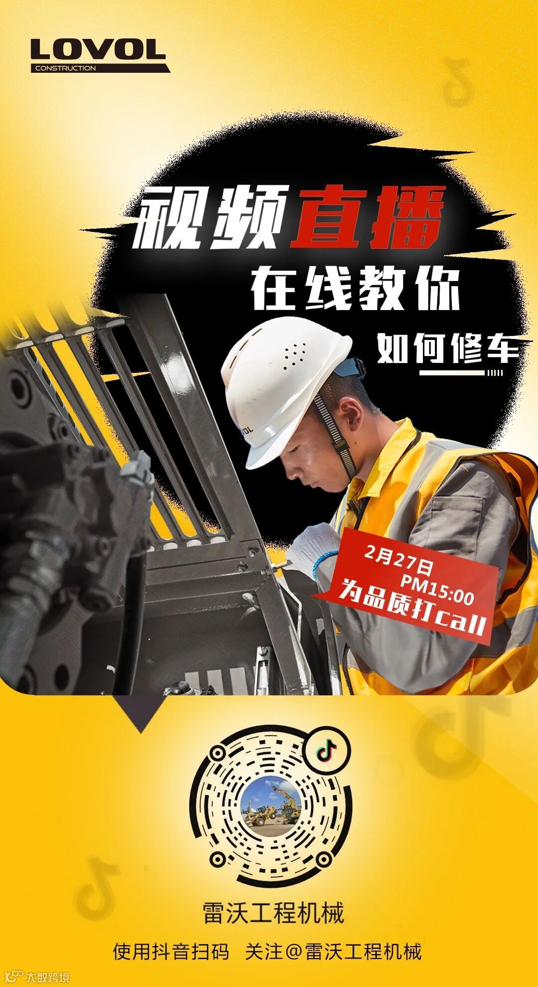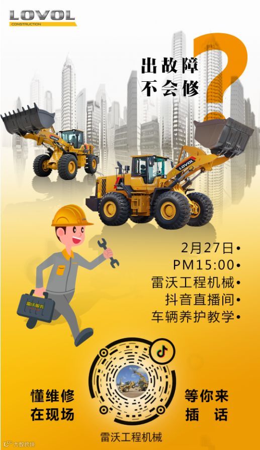 本周的周四、周六,每天下午3点整,雷沃工程机械抖音直播将会为大家现场直播修车大秀。手把手教会大家修车小妙招、养护小常识。更有雷沃技术工程师在线答疑,让您的爱车从此养护无忧。