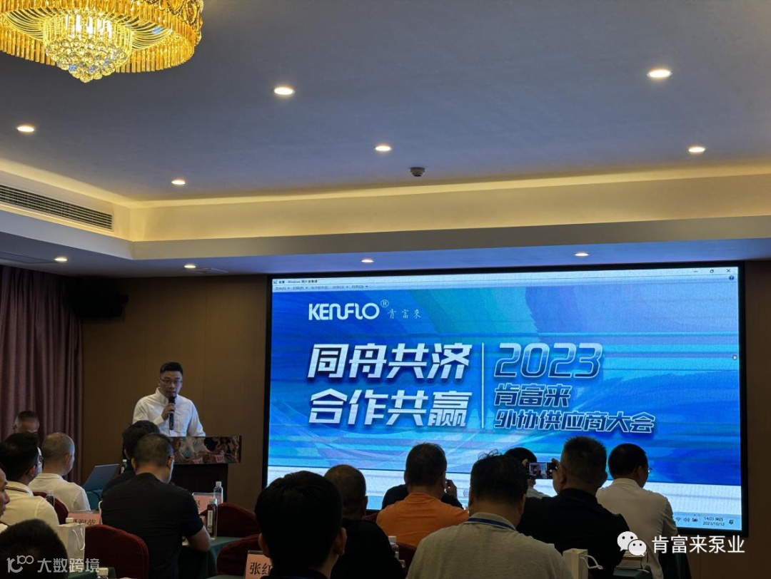 2023年10月12日下午,广东肯富来泵业股份有限公司在佛山佳宁娜大酒店召开了主题为“同舟共济、合作共赢、降本增效、我们共同参与”2023外协供应商大会。陈迪董事长/总经理、招广志副总经理、各中心总监、子公司总经理、相关部门负责人及外协供应商代表出席了会议。