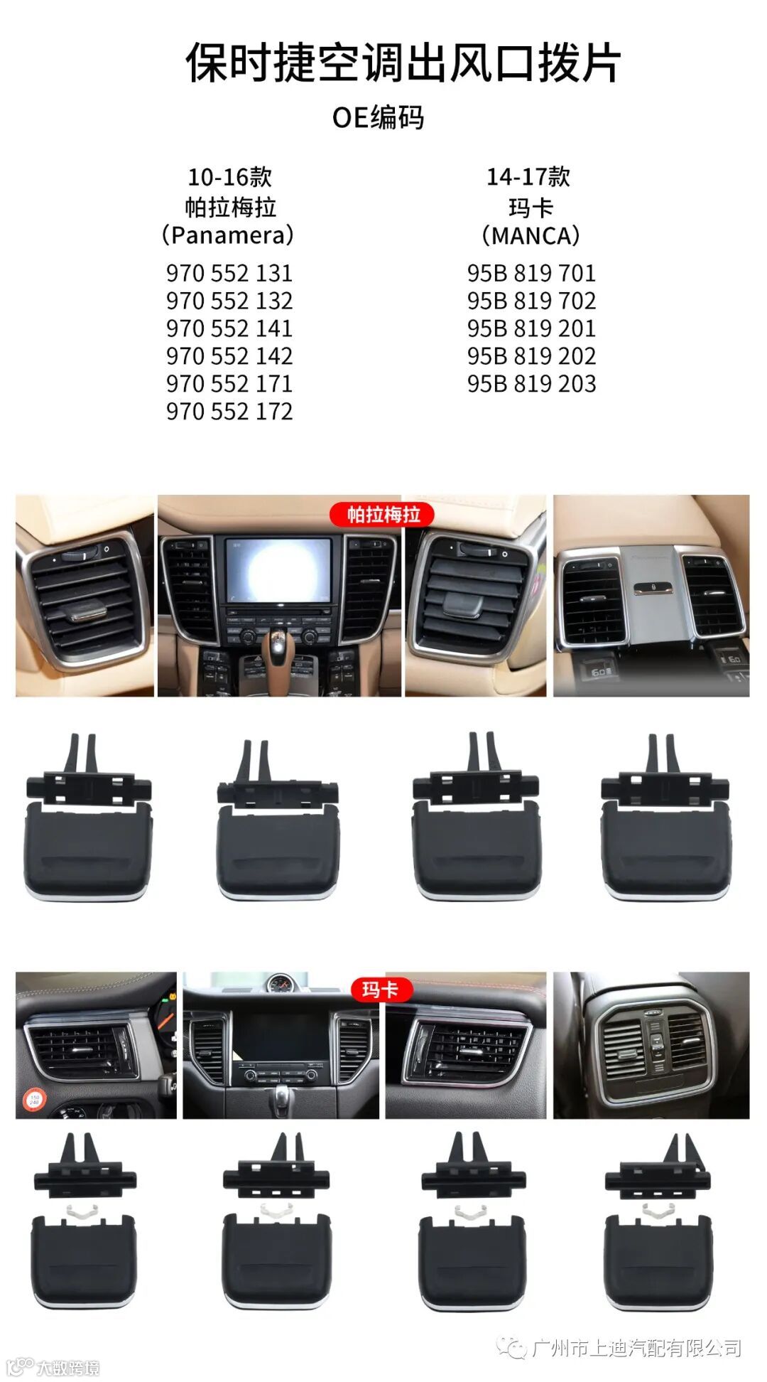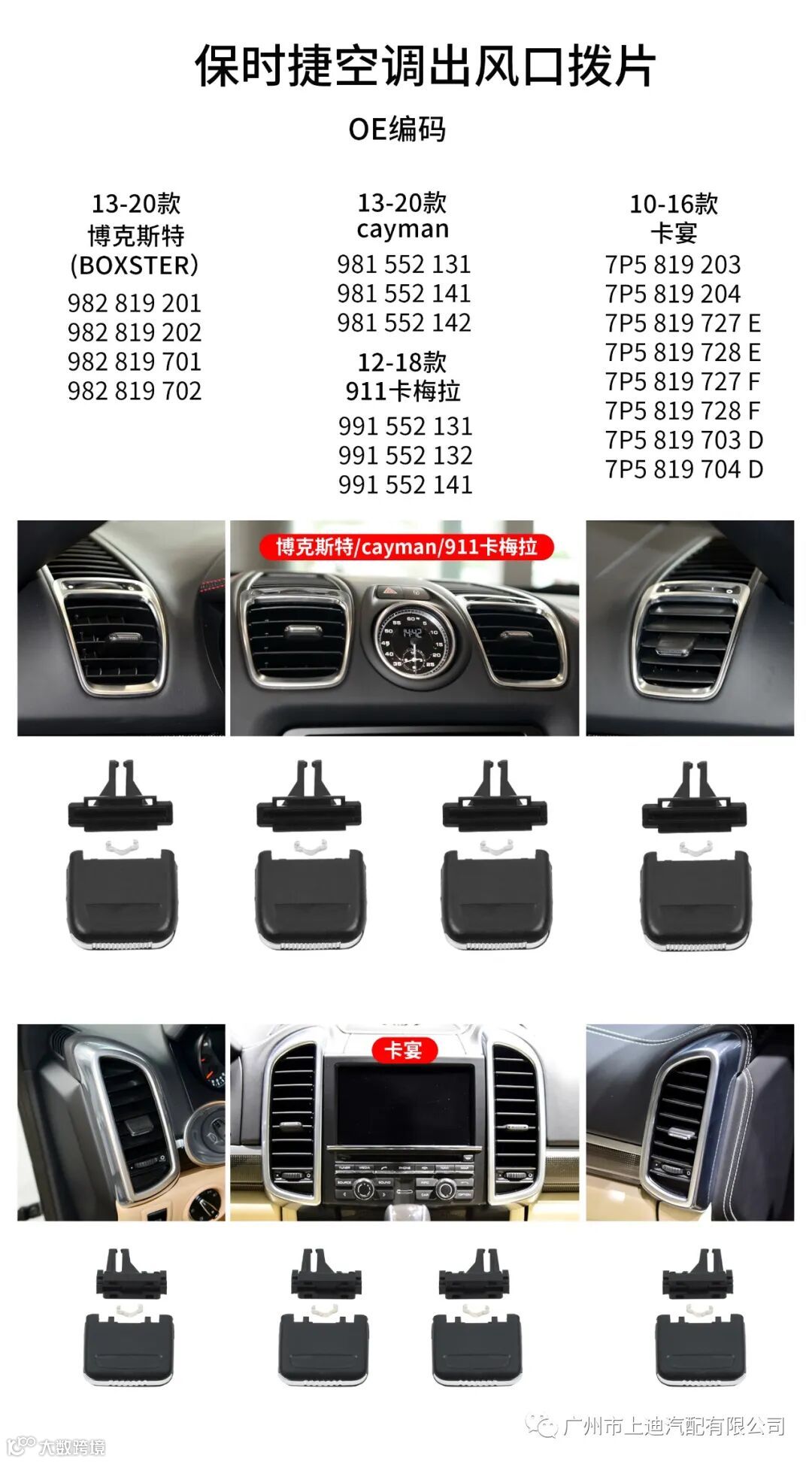 广州市上迪汽配有限公司适用2010-2016款卡宴(Cayenne), 2013-2020款博克斯特(Boxster), 2013-2020款cayman,2012-2018款911卡梅拉,MANCA2014-2017款玛卡(MANCA),2010-2016款帕拉梅拉(Panamera)。