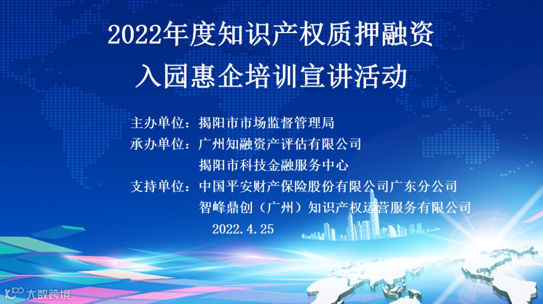 2022年4月25日下午,在揭阳市市场监督管理局(知识产权局)的指导下,广州知融资产评估有限公司联合揭阳市科技金融综合服务中心举行知识产权知识产权质押融资入园惠企线上培训宣讲活动。