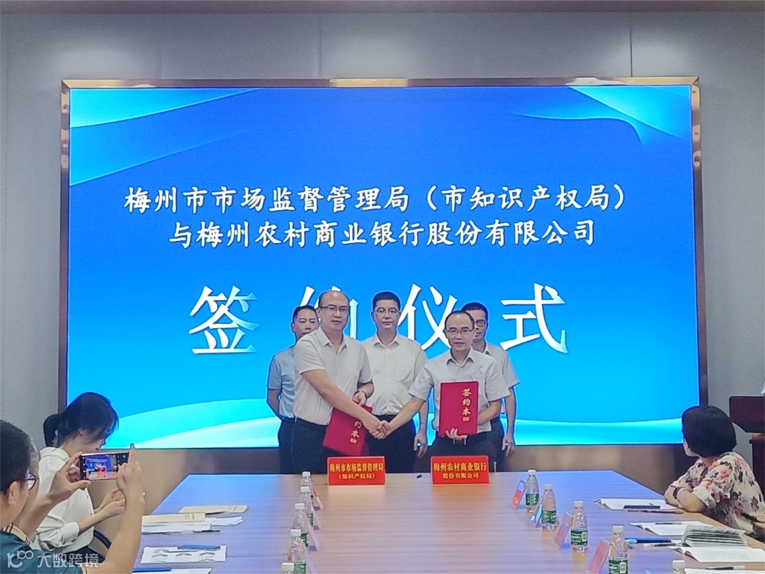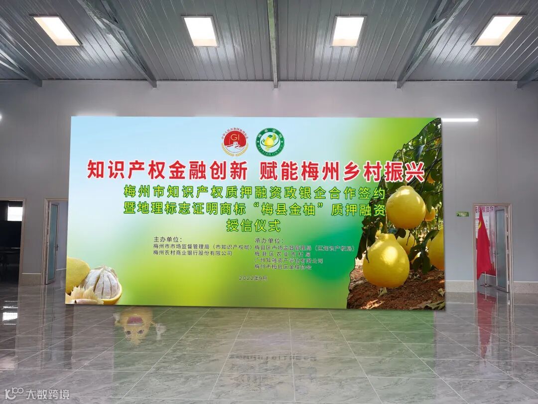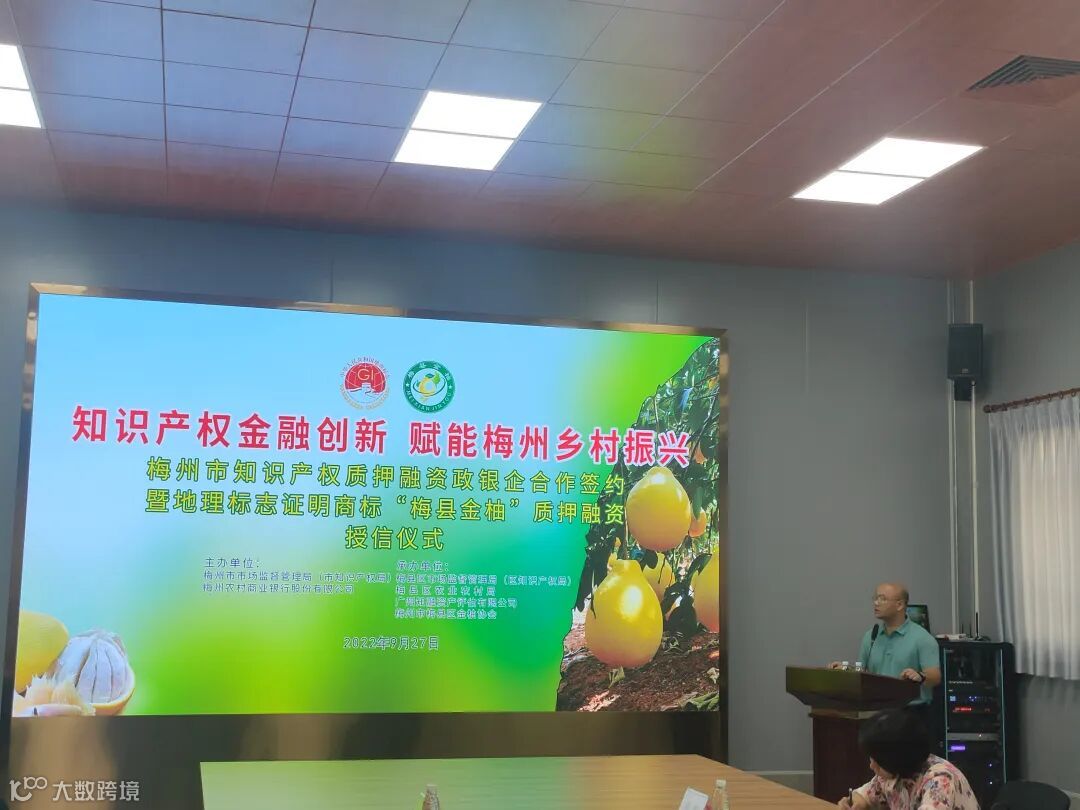 2022年9月27日上午,“知识产权金融创新 赋能梅州乡村振兴——梅州市知识产权质押融资政银企合作签约暨地理标志证明商标‘梅县金柚’质押融资授信仪式”在梅县区国家现代农业产业园城东园区举行,活动取得圆满成功。此次仪式由梅州市市场监督管理局(市知识产权局)和梅州农商银行联合主办,梅县区市场监督管理局(区知识产权局)、梅县区农村农业局、广州知融资产评估有限公司、梅州市梅县区金柚协会共同承办。梅州农商银行对地理标志证明商标“梅县金柚”质押向梅县区金柚协会授信5亿元。
