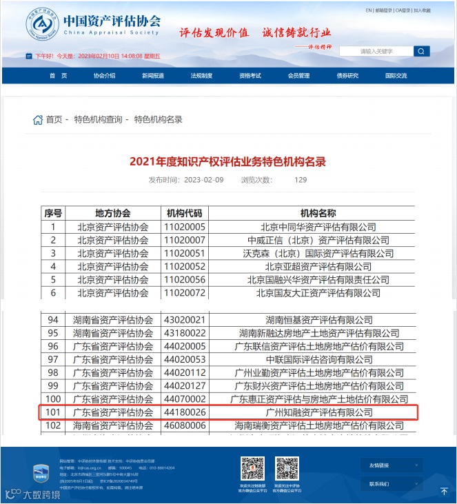 2023年2月9日,中国资产评估协会发布《2021年度知识产权评估业务特色机构名录》,恭喜广州知融资产评估有限公司入选,体现了资产评估行业对我们坚持知识产权评估专业化的认可!