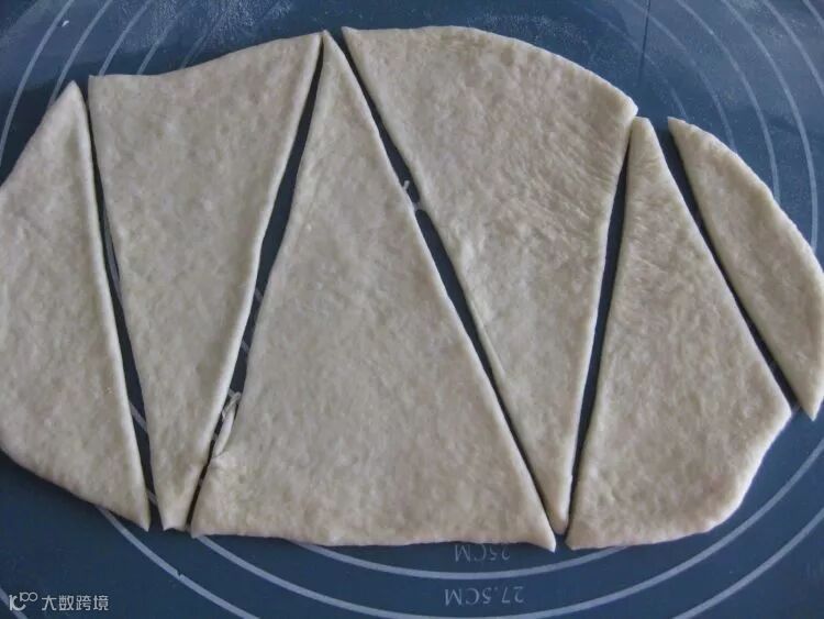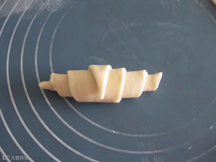 6.整理形状:将面片用轮刀分成三角形的面片,底边中间切一道切口,将面片从底部卷起。