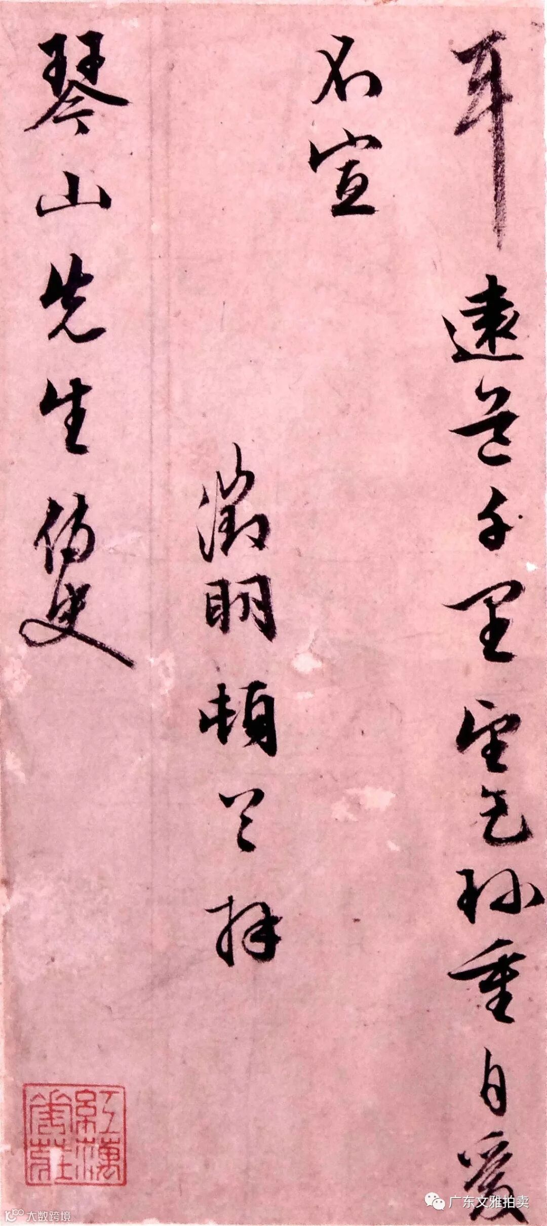 文征明在书法史上以兼善诸体闻名,尤擅长行书和小楷, 王世贞在《艺苑卮言》上评论说:“ 待诏(文征明)以小楷名海内,其所沾沾者隶耳,独篆不轻为人下,然亦自入 能品。所书《千字文》四体,楷法绝精工,有《黄庭》、《遗教》笔意,行体苍润,可称玉版《圣教》,隶亦妙得《受禅》三昧,篆书斤斤阳冰门风,而楷有小法,可宝也。”广东文雅拍卖公司本次有幸在一专收藏明清书画的资深大藏家处征集到文征明一幅信札行书作品,此件作品可以说是研究和学习文征明行书的一个标准版本,实在是可遇不可求。