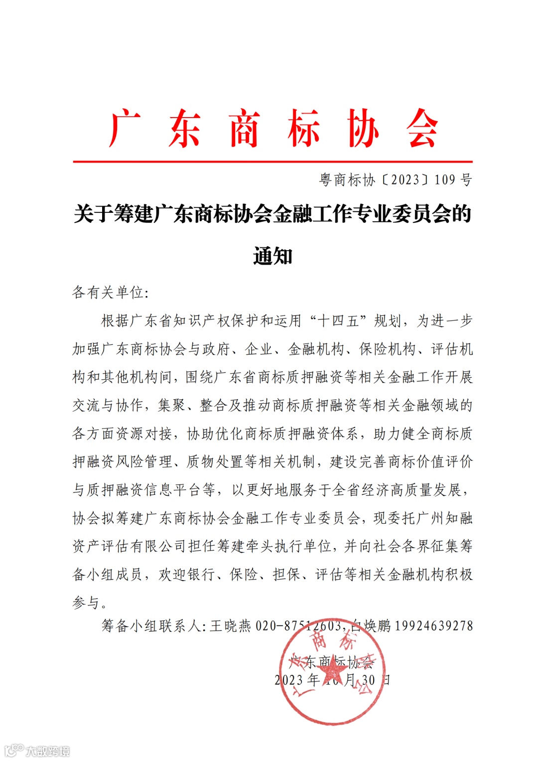 如果您对广东商标协会金融工作专业委员会的筹建工作感兴趣,并希望积极参与其中,我们诚挚地邀请您加入我们的筹备小组。请联系筹备小组联系人王晓燕,电话:020-87512603,白焕鹏,电话:19924639278。