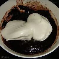 10. 盛1/3蛋白到巧克力糊中,用橡皮刮刀轻轻翻拌均匀(从底部往上翻拌,不要划圈搅拌,以免蛋白消泡)