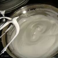 9. 白糖和海藻糖混合一起搅拌均匀,蛋白分3次加入糖,用打蛋器搅打,到干性发泡。