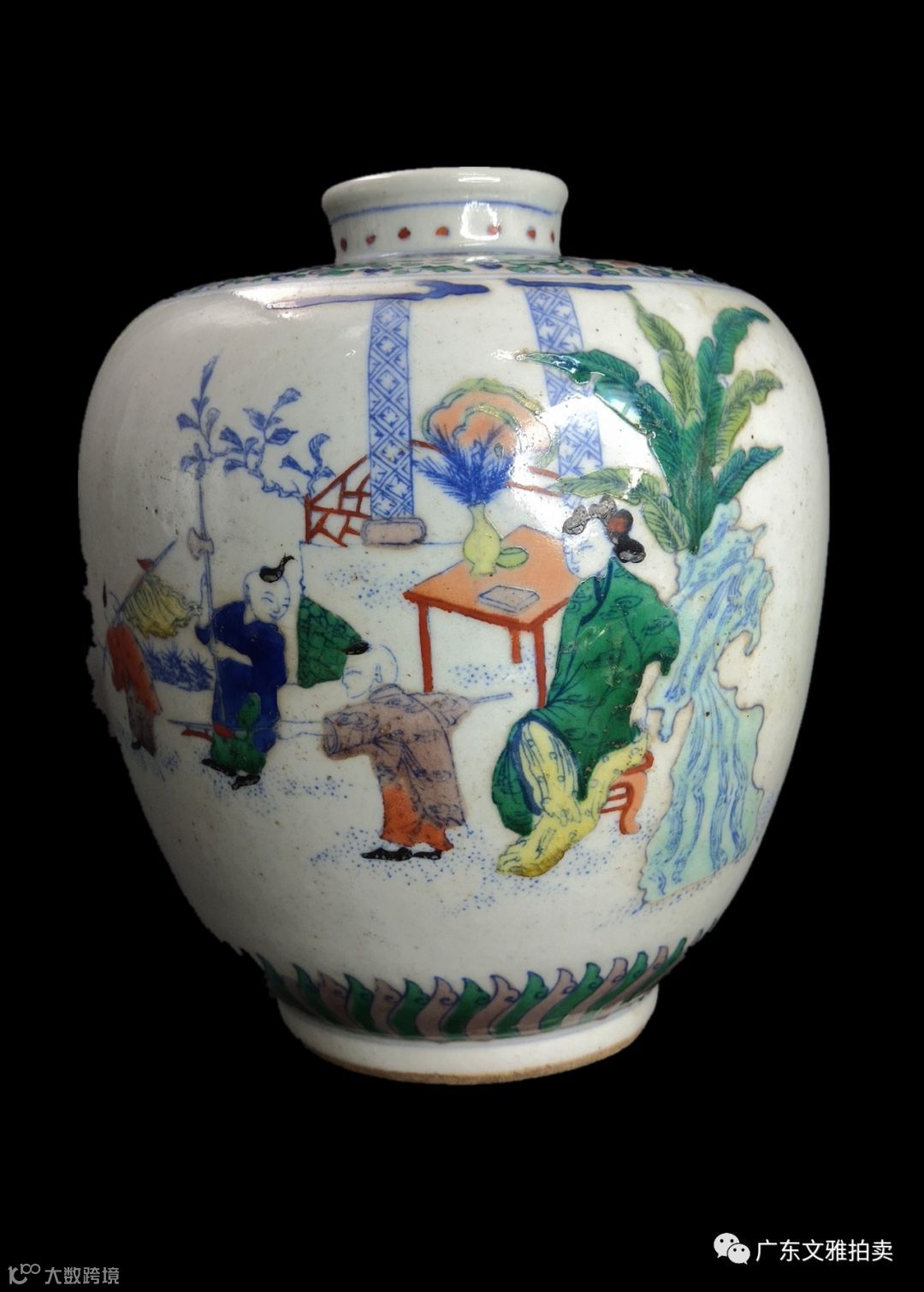 说明:斗彩吐噜瓶画课子图,为典型的康熙年代人物故事特征。因为清朝开国是满人打回来的江山,所以满人少年教育以习武为第一,不象汉人教育以文第一,“万般皆下品,唯有读书高”,到了乾隆年代,太平盛世,满人才开始重视文学,文武全面发展。这幅画正是当年康熙时期的历史记录和写照:一贵妇坐在屋外洞石旁芭蕉树下,正认真看着一群少儿舞刀弄枪,神态十分活泼。整个瓶为通景人物教子故事,有山石树木花草,罐缘口和圈足上端有花纹装饰,罐肩描绘缠枝花卉图案,色彩十分鲜亮。由于经历了数百年的氧化,釉面已经开片,釉面笼罩着一层蛤蜊光,整个罐的包浆呈一种盈润宝光,尤其是绿色的植物釉由内向外发出一种有别于贼光而耀眼的金属般的光芒,看着象有一种厚度感,但抚之则很薄的感觉。清代康熙斗彩瓷器在彩绘技法上仍承袭成化斗彩的风格,纹样采用平涂勾勒,填绘的色彩微微越过釉下青花的边线向外渗透,尤其是这个瓶的浅紫色,都是康熙年代能夠承传了成化斗彩的这种颜色,这也是一个特点。 在色彩的运用和具体施彩的工艺上有了本朝的鲜明特征。这时或将斗彩作为器物的边饰或局部纹饰,或与青花、五彩分绘在一件器物上。斗彩加暗花装饰更为其他时代所不见。康熙朝在继续生产白地斗彩的同时,进一步创烧了黄地、洒蓝地等斗彩器,从而使康熙斗彩瓷器的种类更加丰富多样。 这个瓶的圈足修胎都是康的特征。器形以盘、碗、杯、笔筒、壁瓶为常见,偶然也有稍大的多角形花盆、长腹盖罐、笠式碗、方盒等制品。纹样也以康熙朝流行的龙凤、莲池鸳鸯、缠枝桃、雉鸡牡丹、过枝凤竹、花卉果树、婴戏、携琴访友等为典型。