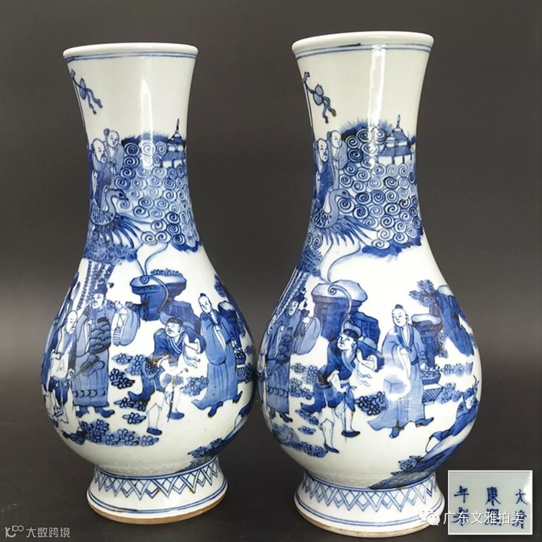 说明:此对瓶胎体润白,釉地莹润,瓶口宽大,两个瓶画的图案一致而非对称,底款为“大清康熙年制”双行六字款,书写工整有力,瓶周身通景青花绘八仙雅聚图,只见仙云亭台之下,八仙正雅集论道,场景甚是喜人。整器青花发色浓淡相宜,层次分明,绘画布局合度,格调古雅清新,大气祥和。