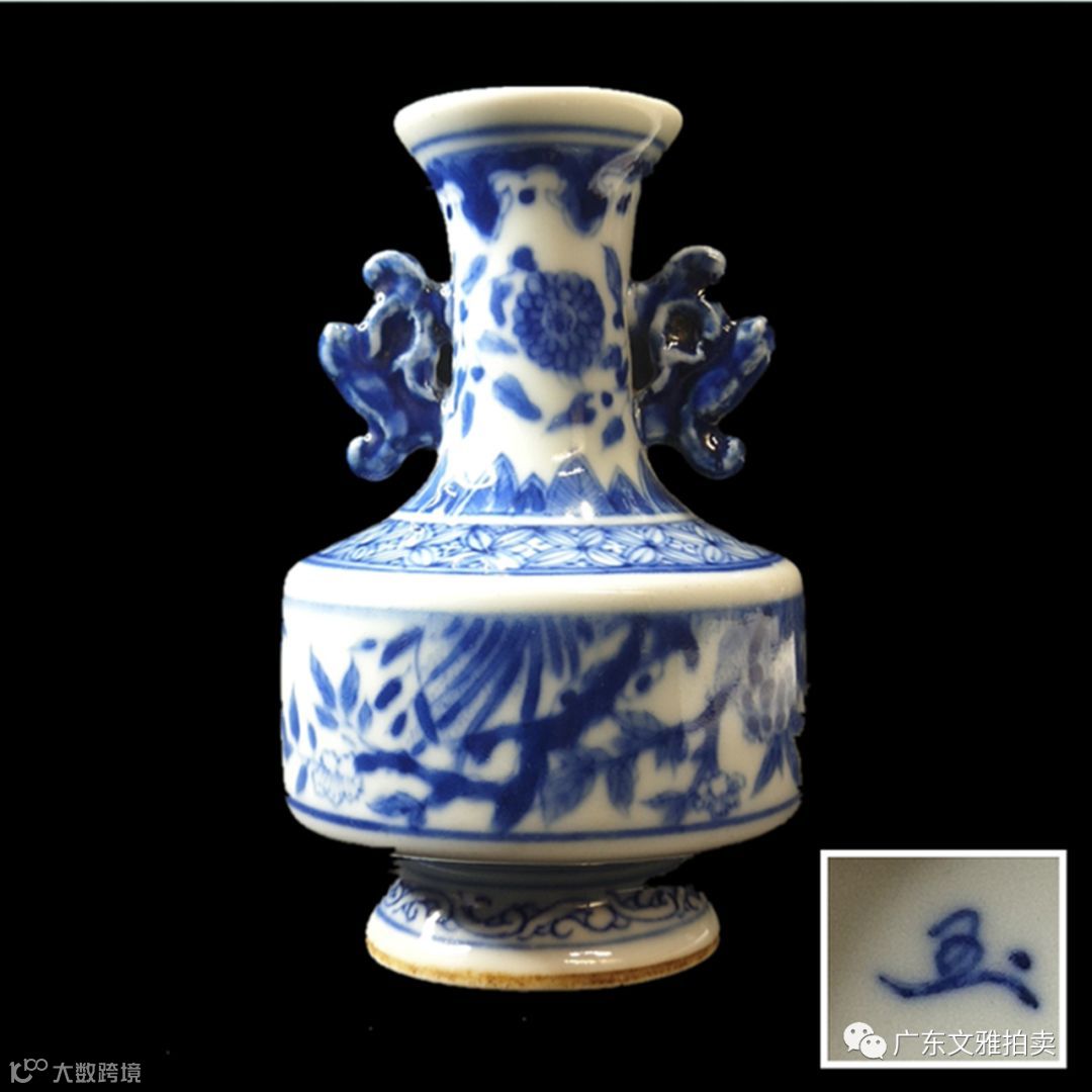 拍号 6 清康熙青花玉字款蝶恋花龙耳瓶 高10.5×6cm