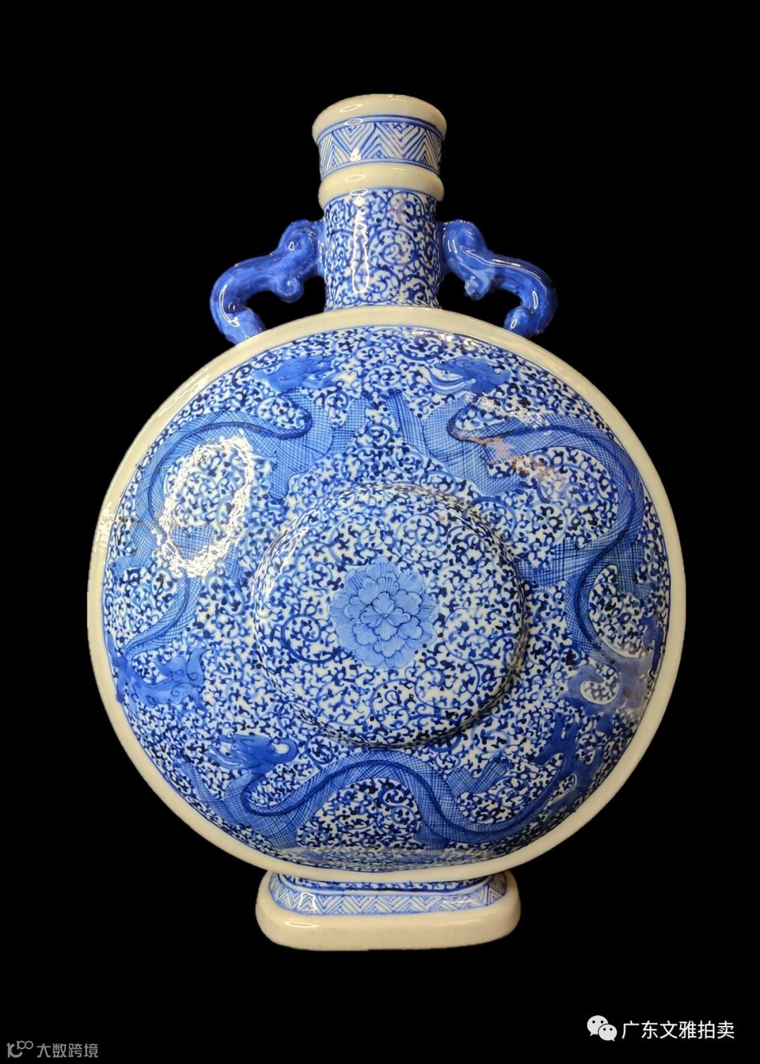 说明:该瓶直口,短颈、颈肩相交处饰对称螭龙耳,扁圆腹,圈足外撇,通体青花纹饰,口沿下及足墙饰三角山纹, 腹两面中心凸起,中间部份和侧面饰缠枝花纹,外围留细白边,向里绘三条龙,形态各异,非常威猛;底绘康熙时代特征的“芭蕉叶纹底款”,此瓶胎质细腻,青花发色纯正。