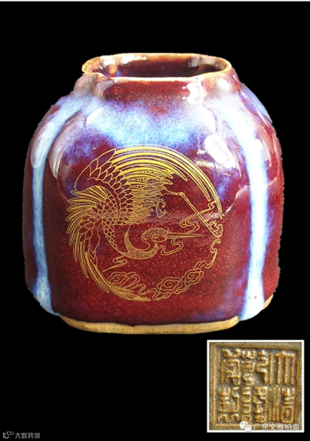 说明:此倭角四方太白缸乾隆本朝。方型,短颈,平底,缸型优美,严格依照传统制式烧制而成。缸壁描金画团鹤纹和双金鱼纹,分画于两对称面,象征长寿,金玉满堂和连年有余,画工精细,金色图案闪闪发光,富丽堂皇;窑变釉釉层肥厚,壁红色面积很大,不同角度呈现出不中深浅,变化无穷,发出金属般光彩,四倭角为蓝色,颈下附近为紫蓝色,整器红蓝晕散交融,美轮美奂。底落“大清乾隆年制”六字三行篆书凸雕款,造型精巧而典雅,窑变釉瑰丽多姿,与一般掌玩巧器气质颇有不同,甚是别致。清代窑变釉是唐英督理景德镇御窑厂之时,在生产仿钧釉基础之上繁衍出的一个新品种,以雍正、乾隆二朝制品最好,釉色以红为主,天蓝、月白、绿及褐等色,交融流淌,犹如火焰般万紫千红,绚丽多姿,是名贵的色釉品种之一,其烧造工艺复杂,清代《南窑笔记》记有:“其钧窑及法蓝、法翠乃先于窑中烧成无釉涩胎,然后上釉,再入窑中复烧乃成,惟蓝、翠一火即就,钧釉则数火乃得流淌各种天然颜色。”窑变釉斑斓的色彩本为仿钧釉失败而出现的非预期窑变现象,但匠师善于取势,巧用化丑为美之艺术手法,对其釉料配方、窑火加以控制,最终创造出此一品种。《稗史汇编》有云:“瓷有同是一质,遂成异质,同是一色,遂成异色者,水土所合,非人力之巧所能加,是之谓窑变”,因有“窑变无双”之说。香港著名收藏家张宗宪先生藏有造型相同的单色釉小尊,可供参考。