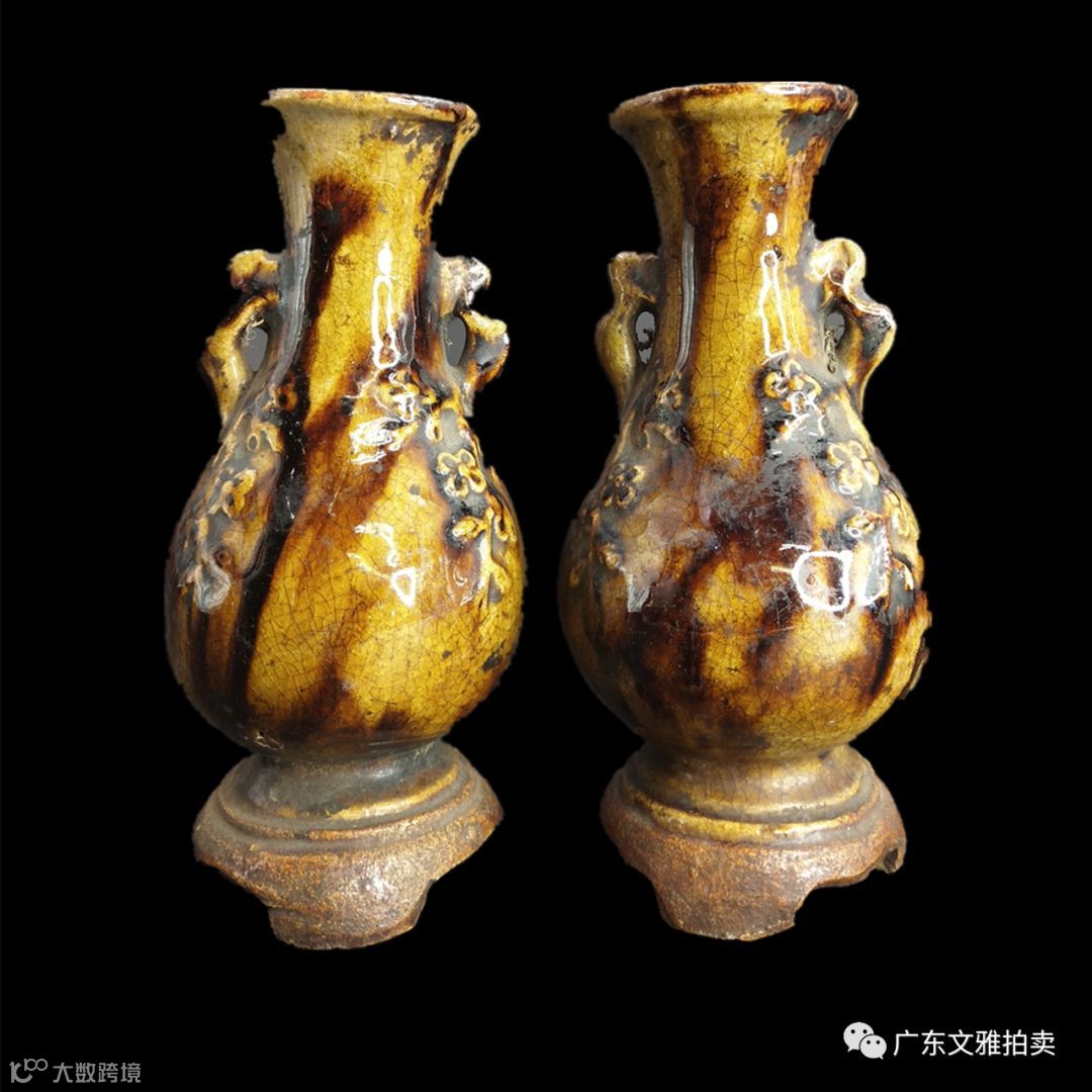 拍号 ★20 清中期石湾窑虎皮斑雕塑梅花双耳瓶一对