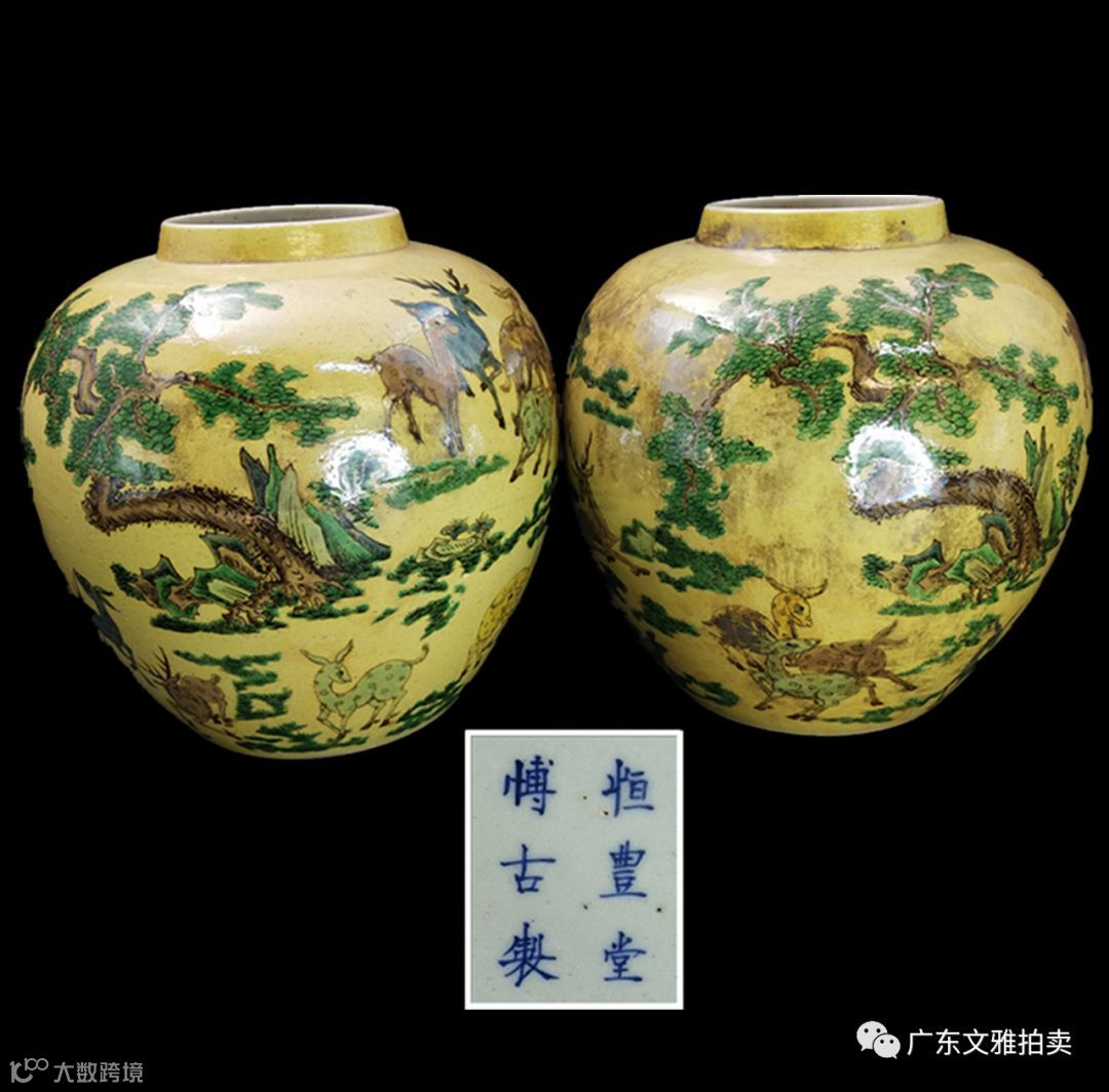 拍号 36 清康熙黄地三彩白鹿莲子罐一对(恒丰堂博古制款)