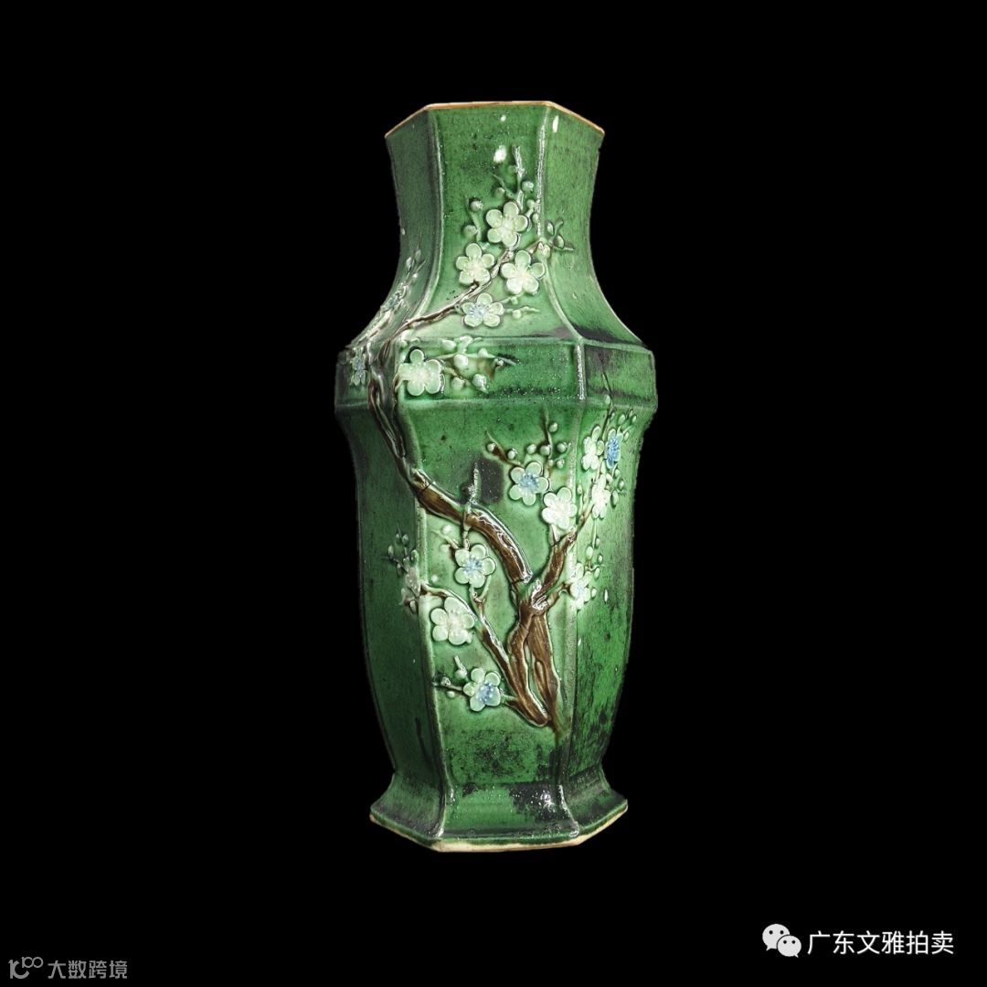 拍号 28 清绿釉地堆塑梅花六方瓶 高19×6.5cm