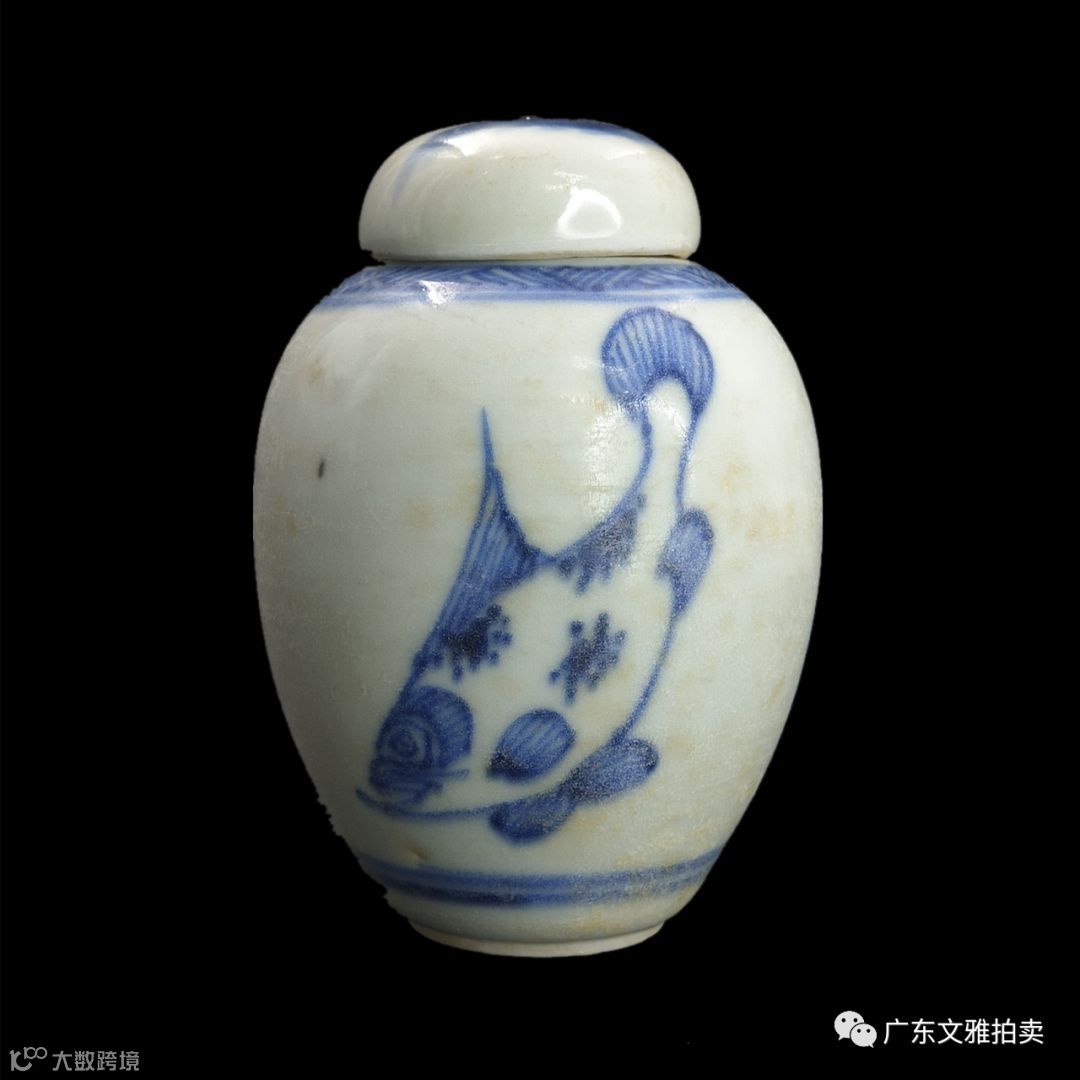 拍号 30 清初青花三鱼莲子小罐 高8×5cm