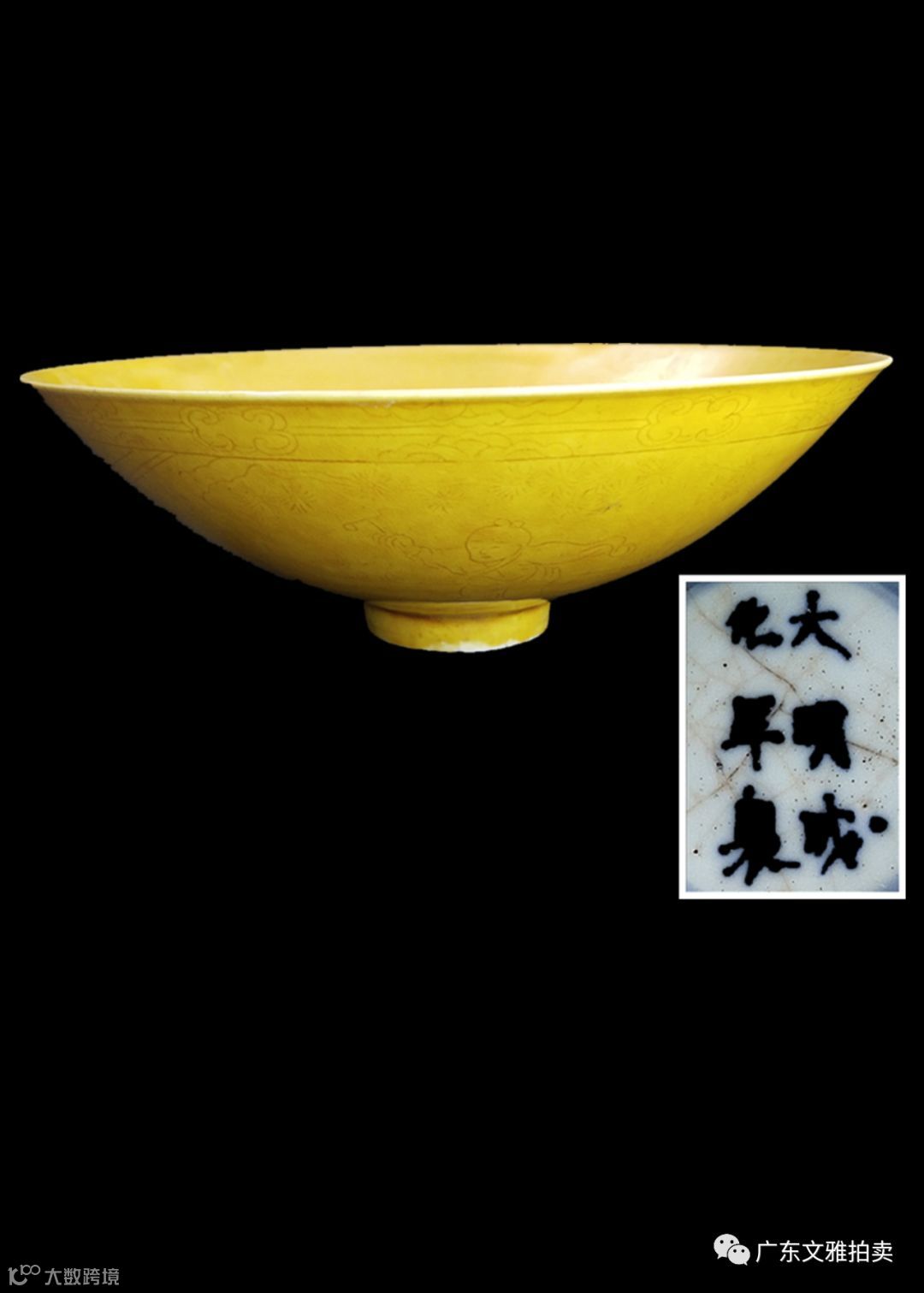 说明:此碗敞口,圈足,修胎规整,造型考究,器底施白釉,双圈青花书“大明成化年制”六字双行楷书寄托款,字体工整清秀,底釉温润如玉,圈足圆润工致,尽得佳瓷品格。内外壁皆施黄釉,釉质光润醇和,入手细腻如玉。外壁黄釉为地,在釉暗刻婴戏图案,刻松树,流云隐隐,芳草茵茵,孩童嬉戏其间,机灵活泼,情态生动,童趣盎然。刻绘极为工丽细致,衣饰褶皱流畅自然,栩栩如生,布局从容,显示了极为高超的制瓷工艺技法。其黄娇妍欲滴。此种黄地戏图斗笠碗,乃为明御瓷一代名品,晚明以来对嘉靖官窑推崇的审美风尚深深影响着康熙官窑的制作,北京故宫博物院藏“康熙款黄地绿彩婴戏图碗”正是此时摹古情怀的反映,此件黄地暗刻婴戏图碗正是此类作品中的典范之作,代表了康熙御窑精湛绝伦的制瓷水平,是为赏玩上佳之名器珍品。