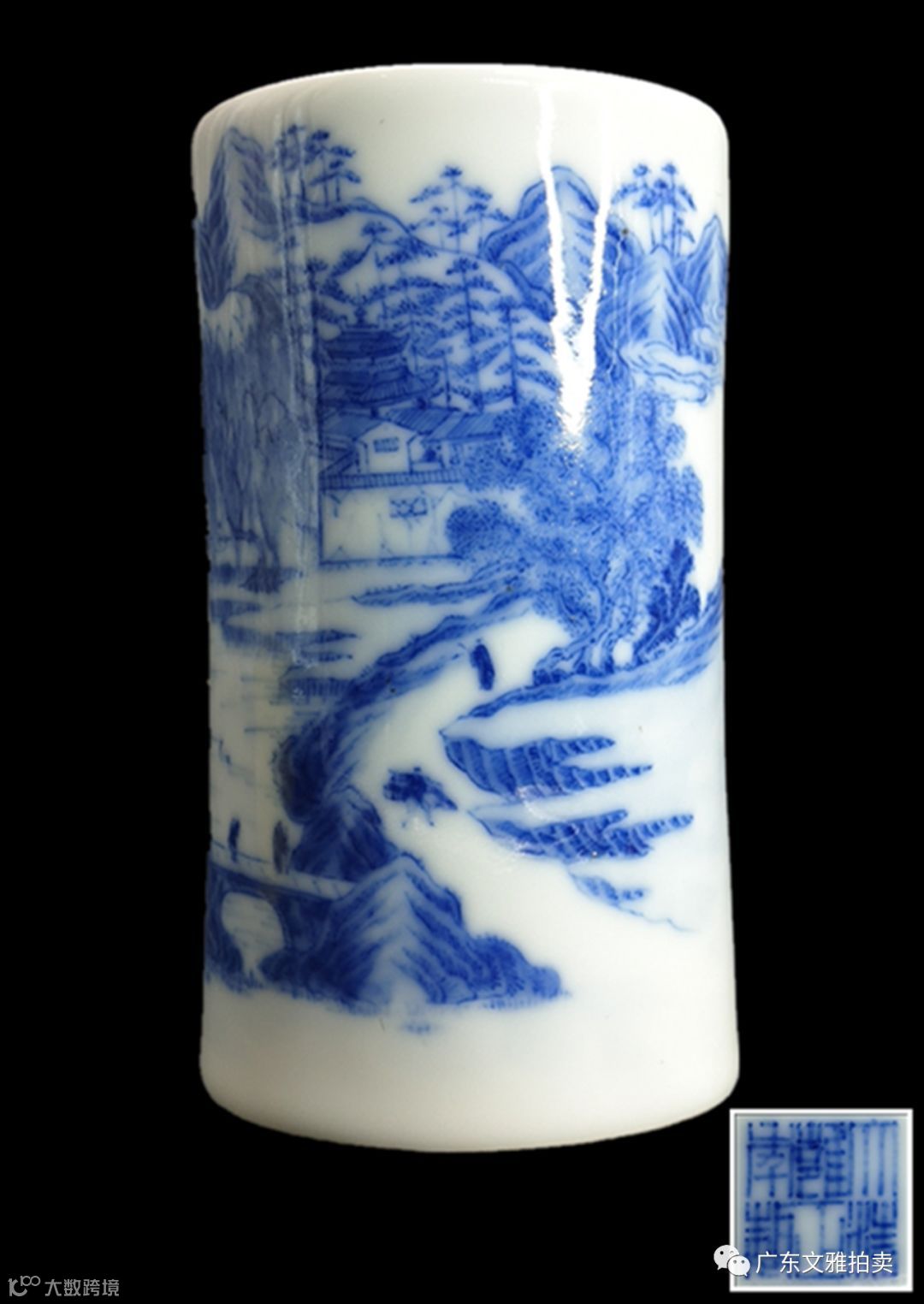 拍号 15 民国 大清雍正年制款青花山水人物通景笔筒