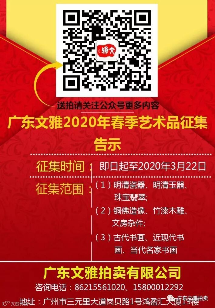 文雅拍卖此次组织的瓷杂类拍品,有一部分拍品首次尝试了由第三方和委托方共同提供品质担保,即保证买受人在购买后七天内在原样无损的情况下实行品质退货退款(落槌价)保障。此举必将进一步的保障了一些刚入行想买但又不敢买的新藏家,这对本公司和消费者甚至是委托者都起到了相互提升相互促进的良性作用。详情可致电本公司咨询。