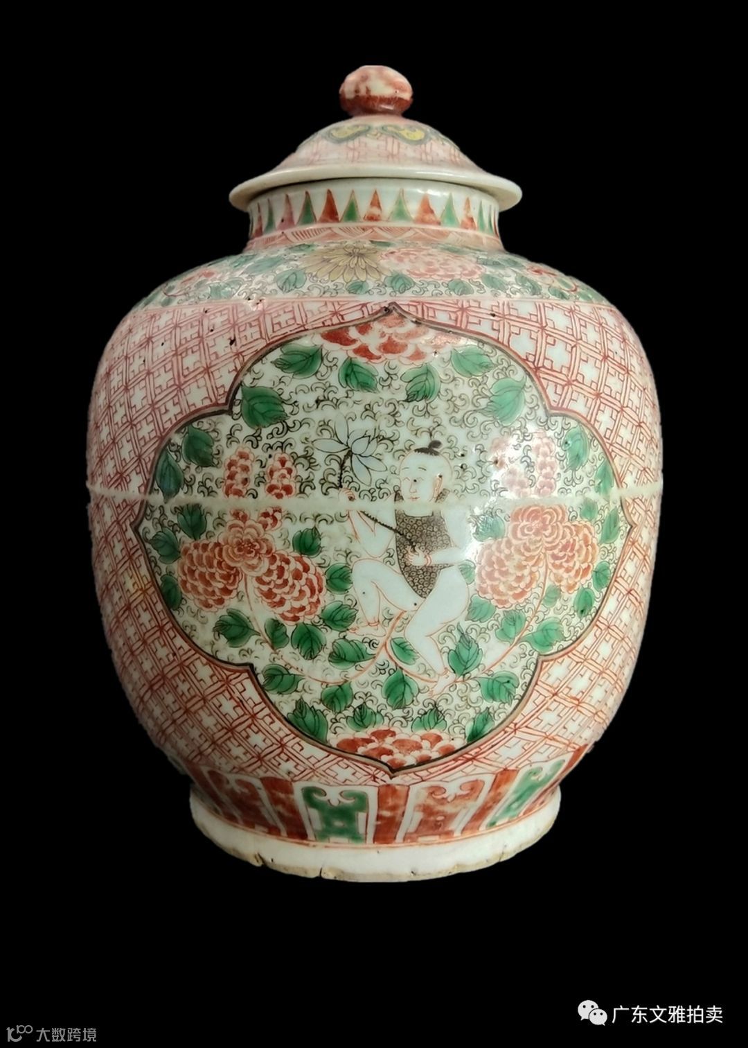 拍号 35 明嘉靖五彩娃娃莲子盖罐 高24×17cm