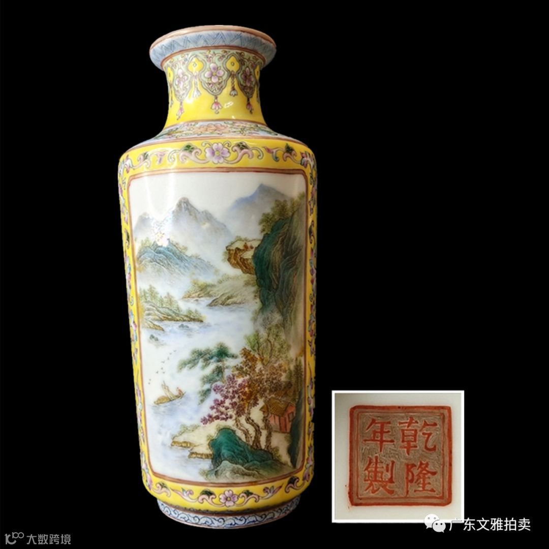 拍号 13 民国黄地开光珐琅彩统瓶 高21×8cm