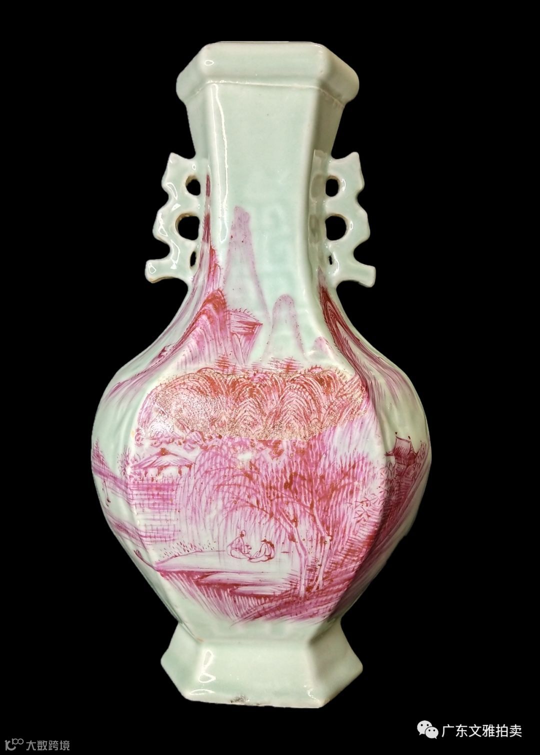 拍号 11 清乾隆豆青地印花珐琅彩人物山水六方双耳瓶