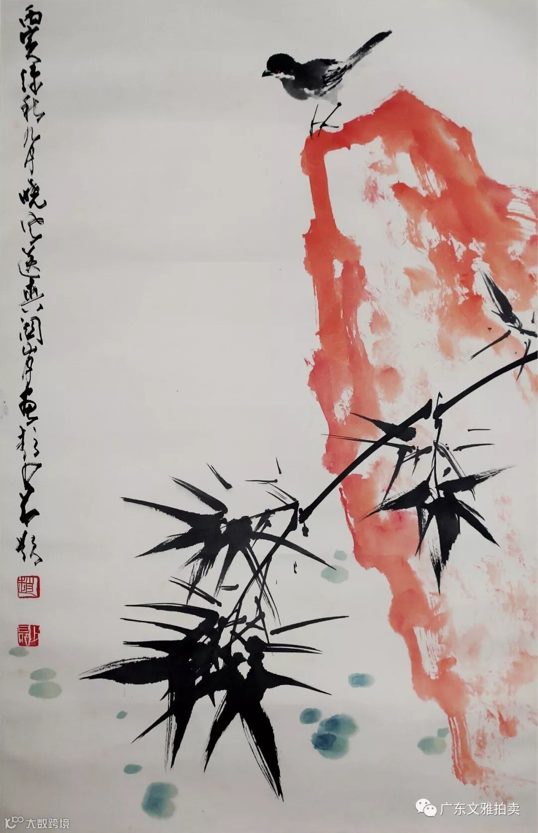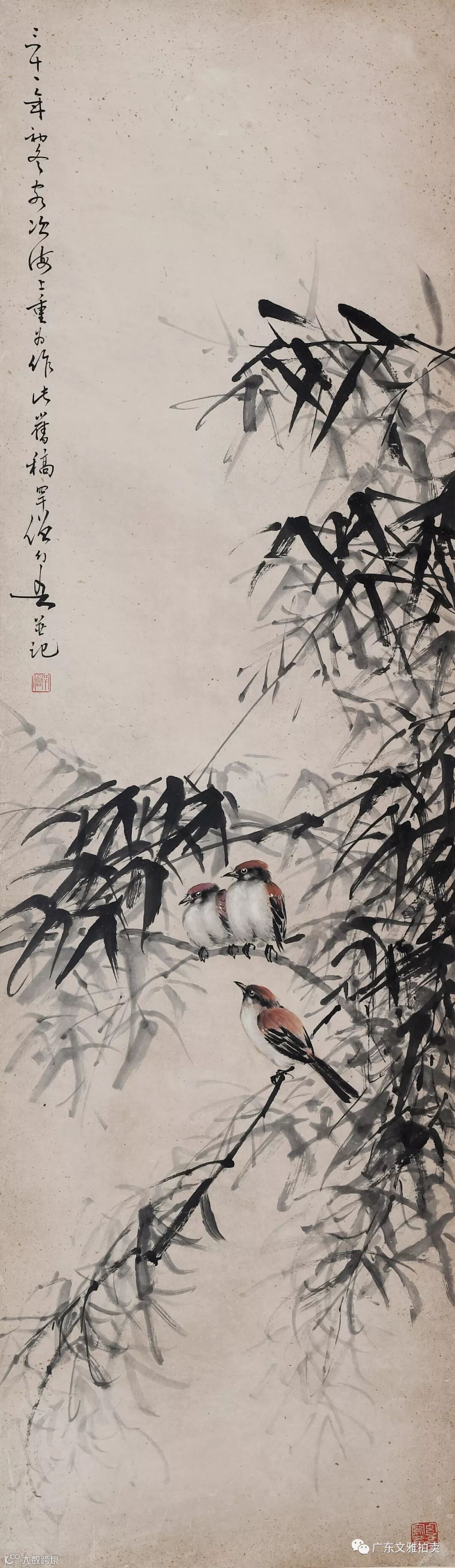 219 赵少昂、关山月合作 竹鸟图 纸本镜片