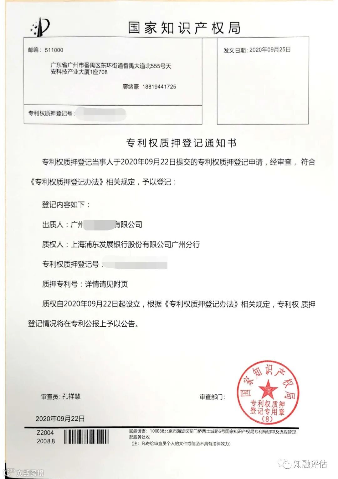 9月22日,知融评估完成了,在浦发银行广州分行的第一笔专利质押融资业务!