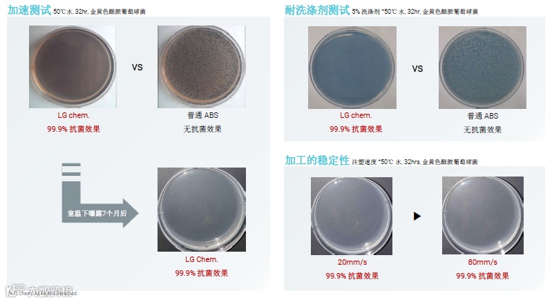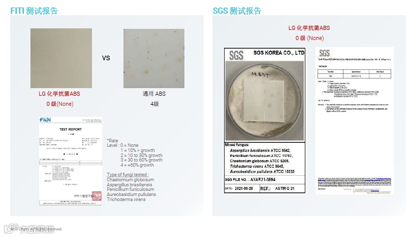 (抗真菌性能能够达到 0 级ASTM G21 认证,并证实了真菌无法在LG化学的抗菌ABS表面存活。)