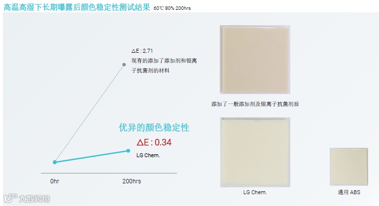 (在高温高湿条件下长期曝露后,LG化学的抗菌ABS能够保持较小的颜色变色)