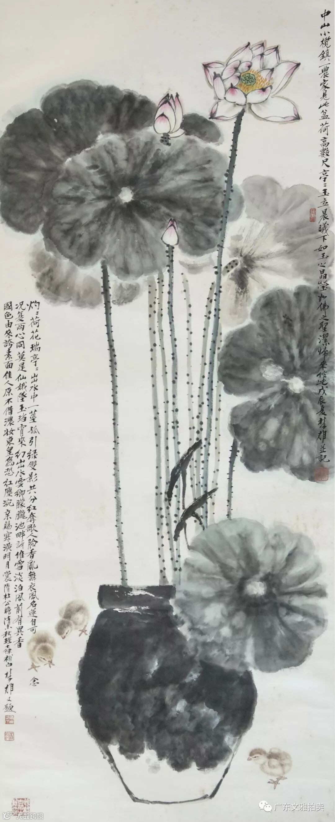 方楚雄 荷花雏鸡 立轴 177x70cm 约11.2平尺 起拍价RMB无底价