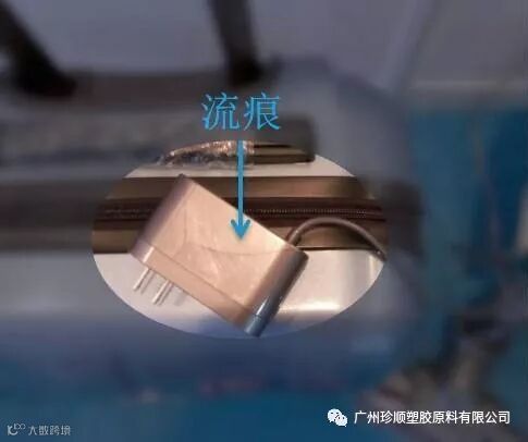 2.流痕产生于直流道系统(没有浇口和分流道),特别是对PC材料,随着在冷的模腔中的流动,热损失越大,它的粘度也就越大。