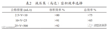 (4)在液压泵的容积效率选择上,液压泵在使用一段时间后,其容积效率将会一定程度降低,以轴向柱塞式液压泵为例,可按照表2指标综合考虑,其中若选用变量泵,各项指标可以比同等排量的定量泵低1%。