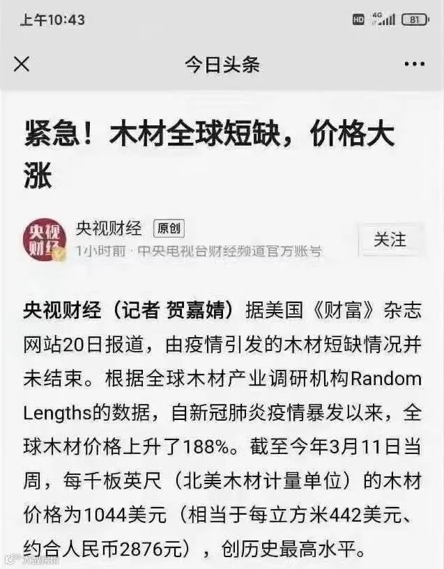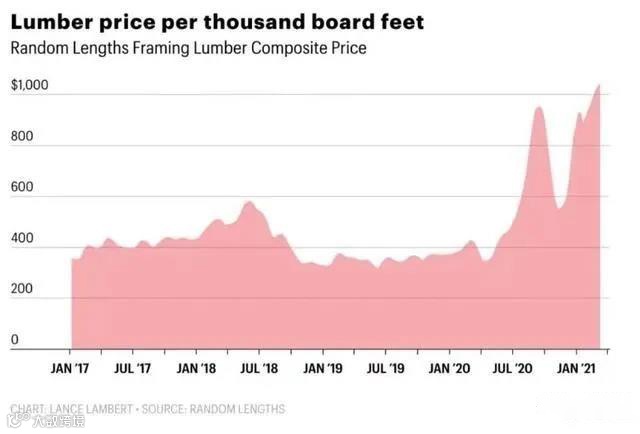 木材价格上涨,一方面是由于疫情限制措施降低了锯木厂的工作效率,导致木材供应量下降,而在隔离期间更多美国人对房屋进行装修,推高了对木材的需求。此外,低利率政策,加上现房库存不高,使得建筑商纷纷加紧建房,也导致木材紧缺问题更为严峻。