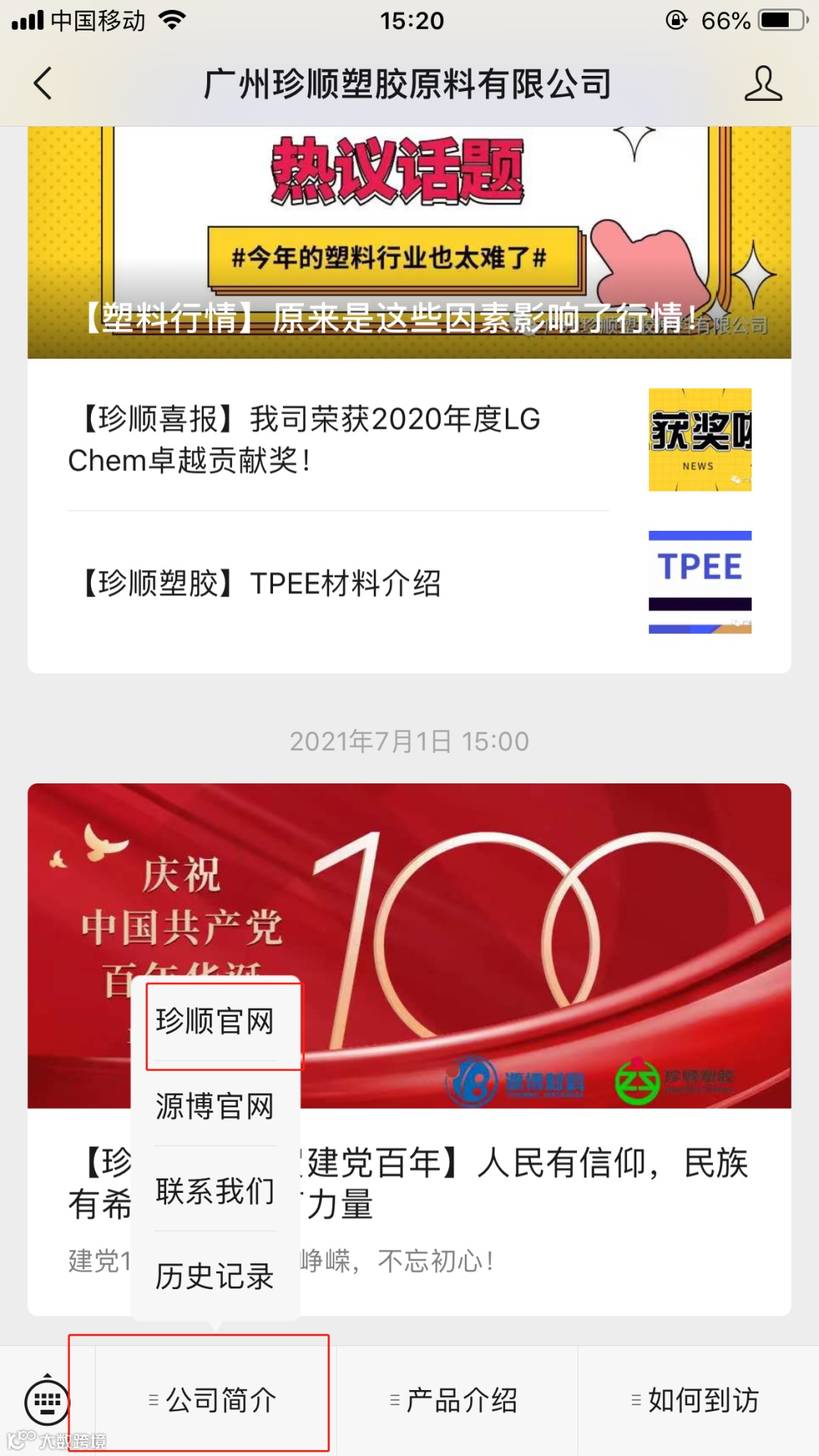 广州珍顺官方微信公众号底部菜单:公司简介 / 珍顺官网 进入