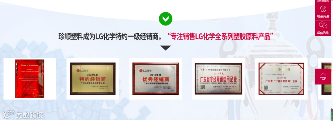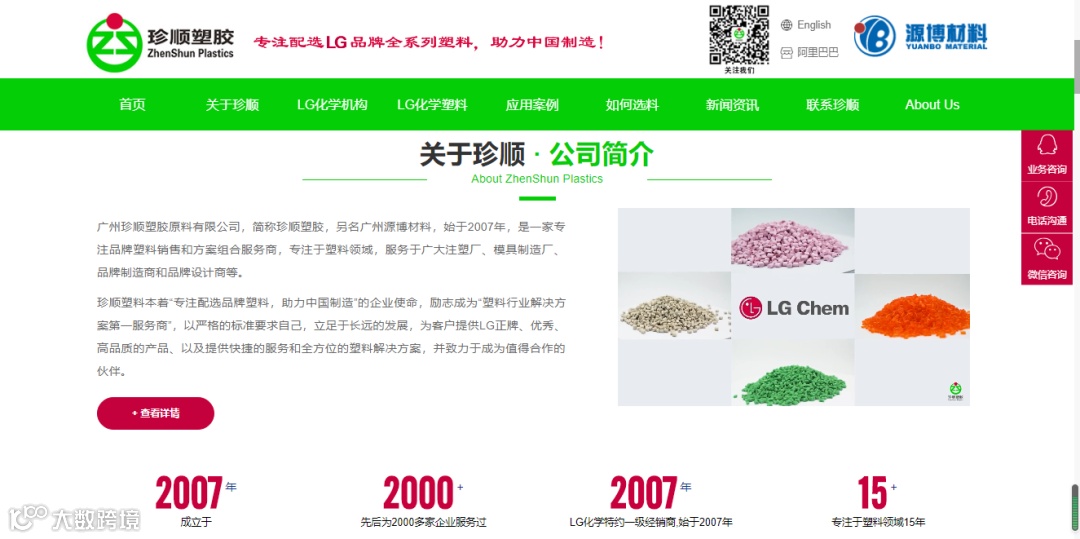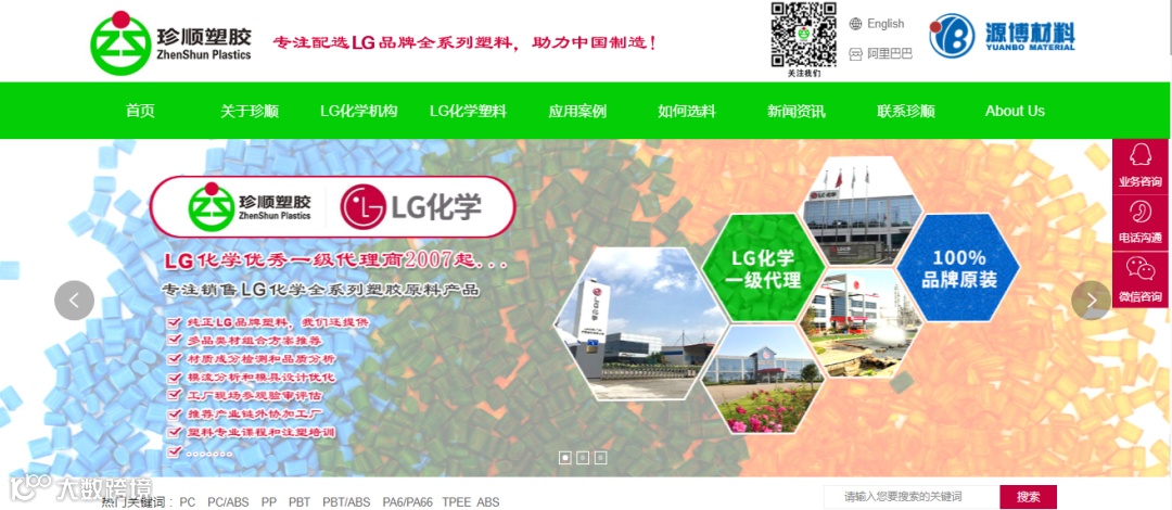 新上线官网设置关于珍顺、LG化学机构、LG化学塑料、应用案例、如何选料、新闻资讯、联系珍顺七大板块,首页顶部新增“阿里巴巴”按钮,点击按钮可直接跳转到珍顺源博阿里巴巴商城,实现产品购买对接。整体色调结合珍顺LOGO,以绿色为主,红色为辅,设计风格简洁明快,更有交互式呈现方式 ,点击“联系怎顺”即可查询或在线留言。保留自适应架构设计,适合手机、平板等各类终端在线浏览,便于小伙伴随时了解需要的信息,提供一流的视觉体验。