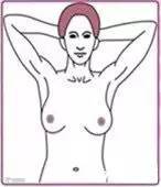 2、抬起一侧手臂看另外一侧乳房是否正常随之抬起。检查乳房与腋下结合部有无异常。双手牵过头顶,身体转向一侧反复观察乳房的侧面,然后观察另一侧。