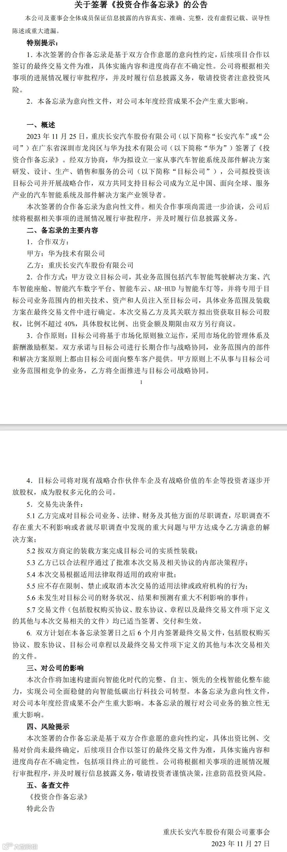 11月26日,重庆长安汽车股份有限公司(以下简称“长安汽车”)发布了关于签署《投资合作备忘录》的公告: