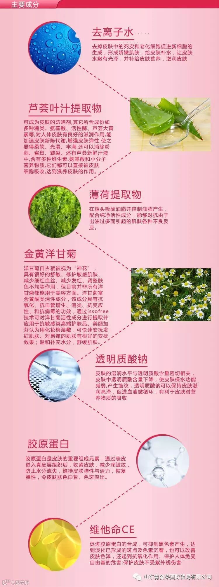 粉爱天使蚕丝面膜升级版,内含纯天然活酵母成份、胶原蛋白、透明质酸、各种纯天然植物精油等。