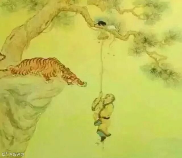 有一个人在森林中漫游的时候,突然遇见了一只饥饿的老虎,老虎大吼一声就扑了上来。他立刻用生平最大的力气和最快的速度逃开,但是老虎紧追不舍,他一直跑一直跑一直跑,最后被老虎逼入了断崖边上。