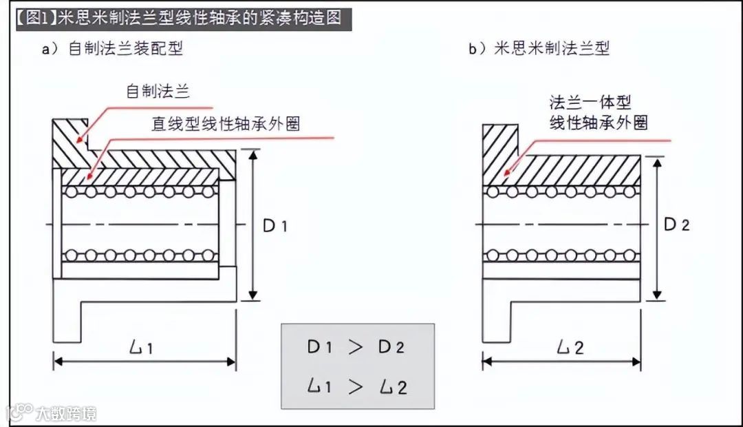 【图1】是法兰型线性轴承的紧凑结构说明图。直线轴承与法兰组装构造、轴套外形过长,而带法兰直线轴承采用一体化构造、结构紧凑。可实现保持耐载荷性能的紧凑化设计。