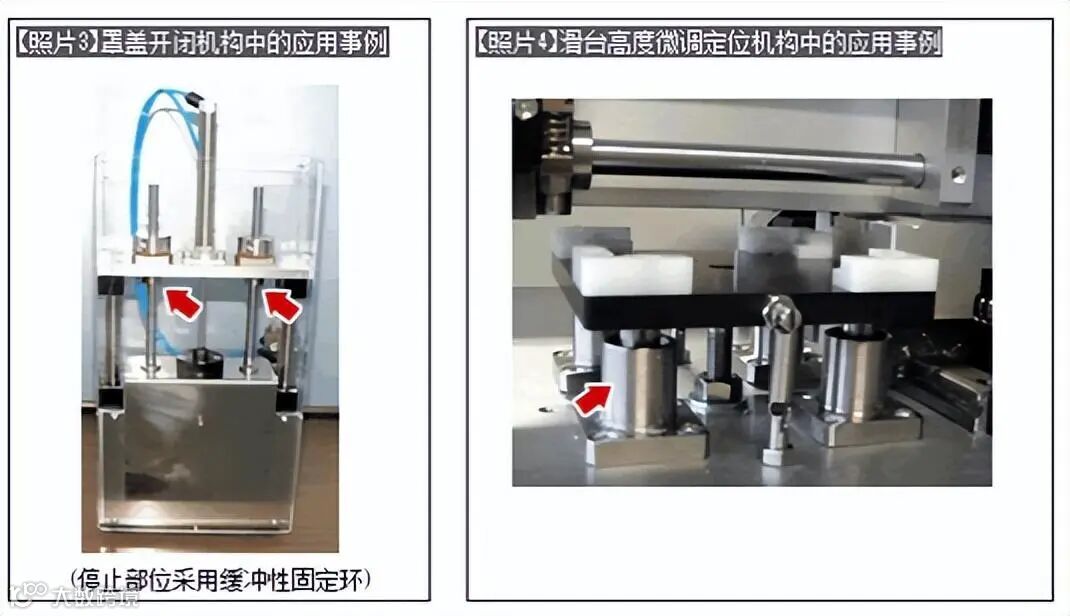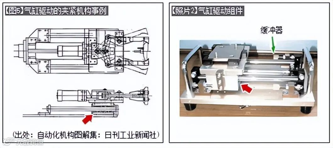 气缸驱动无法控制启动停止时的速度,需要通过使用缓冲器来减少停止时的冲击。(【照片2】)。