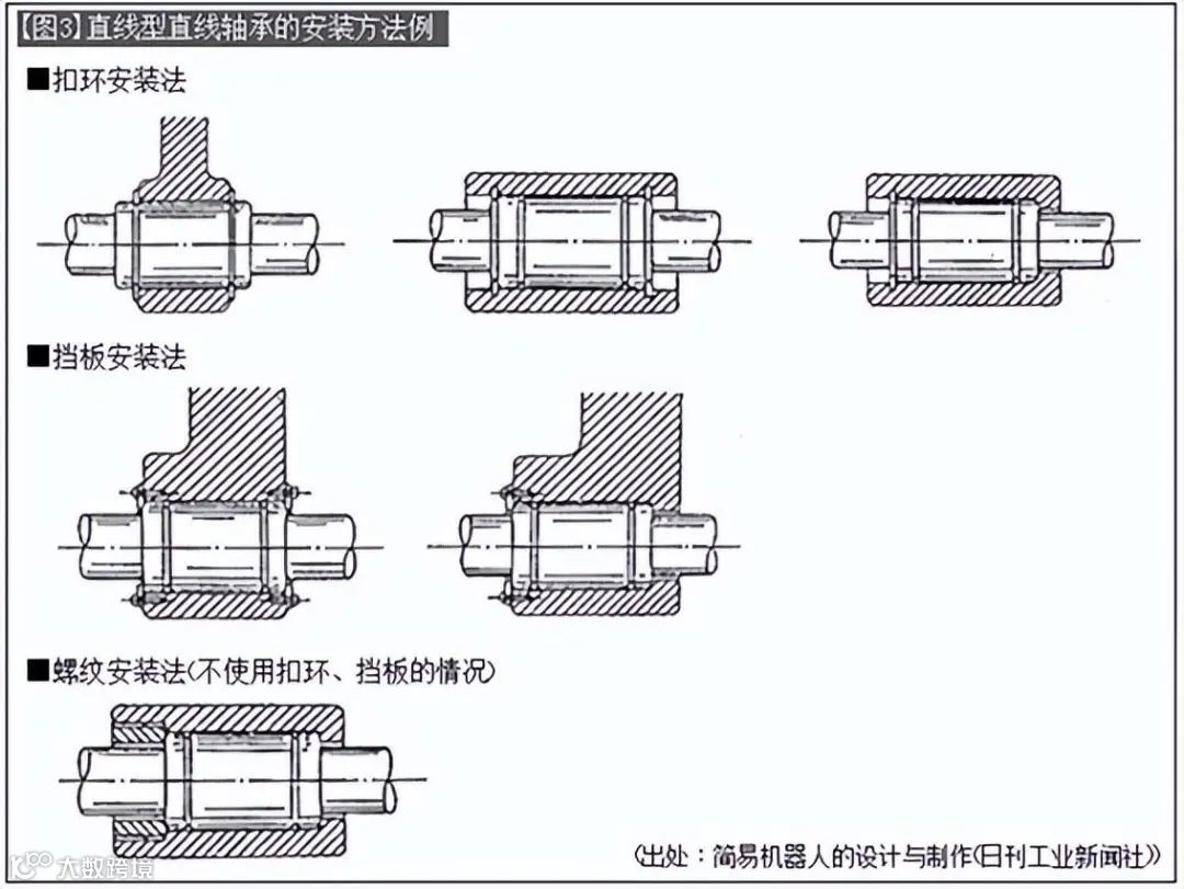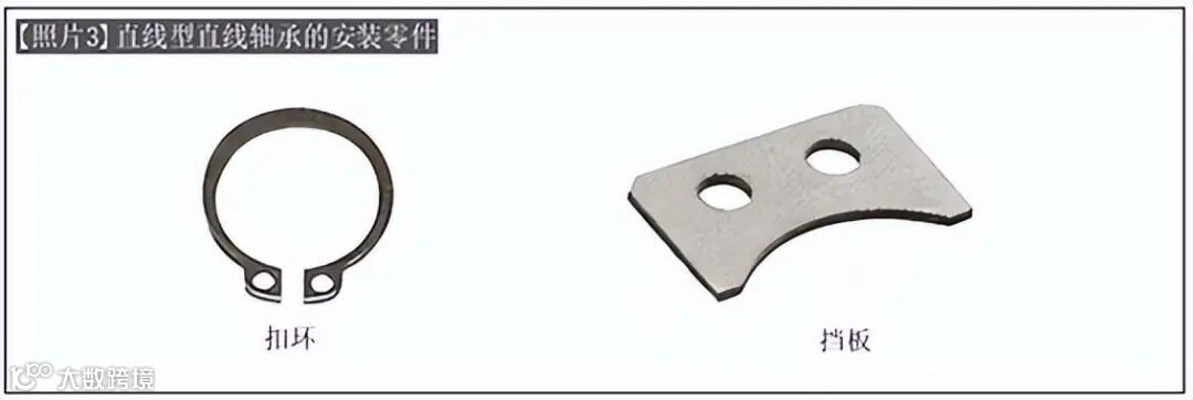 直线轴承一般采用扣环或挡板固定的安装方法(参考【照片3】、【图3】)。