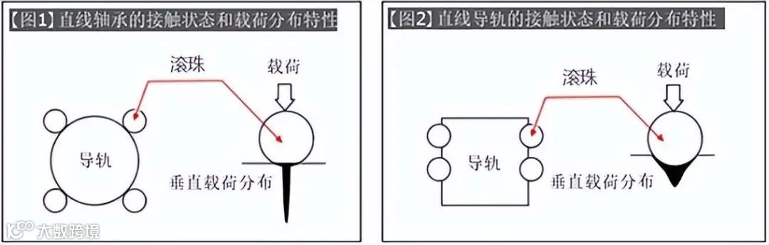 直线轴承和直线导轨,各自滚珠和导轨间的接触状态不同。直线轴承为点接触状态,接触部局部承受较大载荷。直线导轨的导轨与滑块滚珠接触部采用凹槽形状,使得滚珠与导轨面呈面接触状态,接触部载荷呈分散状态。在滑动部接触状态方面两者的承载特性也存在差异。(【图1】【图2】)