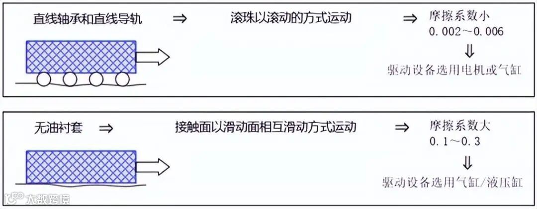 在这里,导向滑动方法的差异(滚珠滑动或表面滑动)决定性能差异。摩擦系数的差异,直接关系到驱动执行机构的选择。