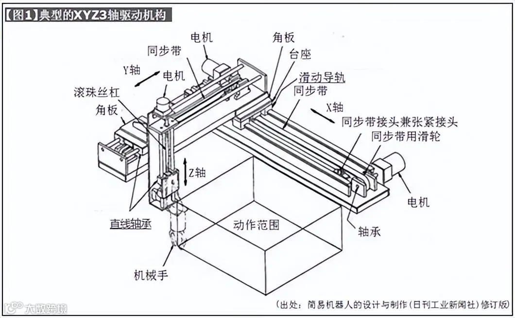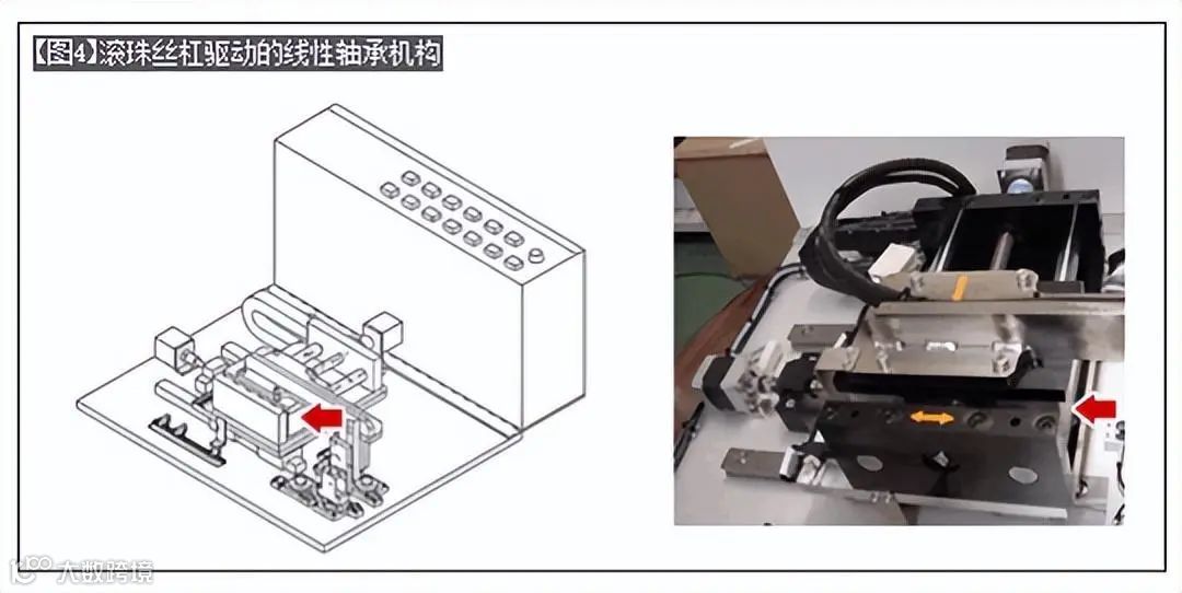 【图4】是Y轴采用直线轴承和滚珠丝杠构造的驱动机构。通常应用于要求单位进给或有定位精度要求的机构
