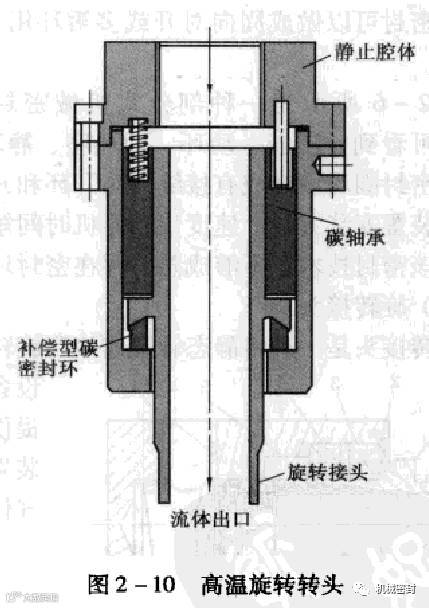 图2一10示出了达到2.0MPa的蒸汽或传热油用高温旋转接头。一浮动碳密封环在一侧具有一个径向端面,在另一侧具有一个凸起端面。一个同样为碳石墨制成的滑动轴承将弹簧力传递到密封界面。当碳浸渍树脂时允许工作温度达到250℃,当浸渍金属时允许达到350℃,耐温垫片用于静密封。