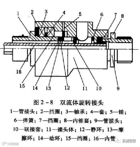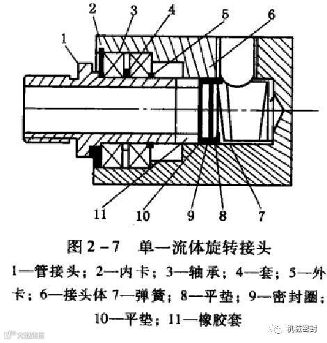 下面介绍几种旋转接头结构。图2一7为单一流体旋转接头结构,管接头1为旋转部分与旋转腔联接,接头体6为静止部分与静腔联接,密封部分由7,8 ,9,10,11组成,此种结构只有一个流体通道。图2一8为一种双流体旋转接头结构,管接头1为旋转部分与动腔联接,接头体11和管接头9为静止部分,可分别联接两流体静腔,内管内、外均有流体,序号6、10、1、13、14为密封部分,防止流体泄漏;8、16之间密封,防止流体互混。此种结构是在图2一7的基础上拓展而成。